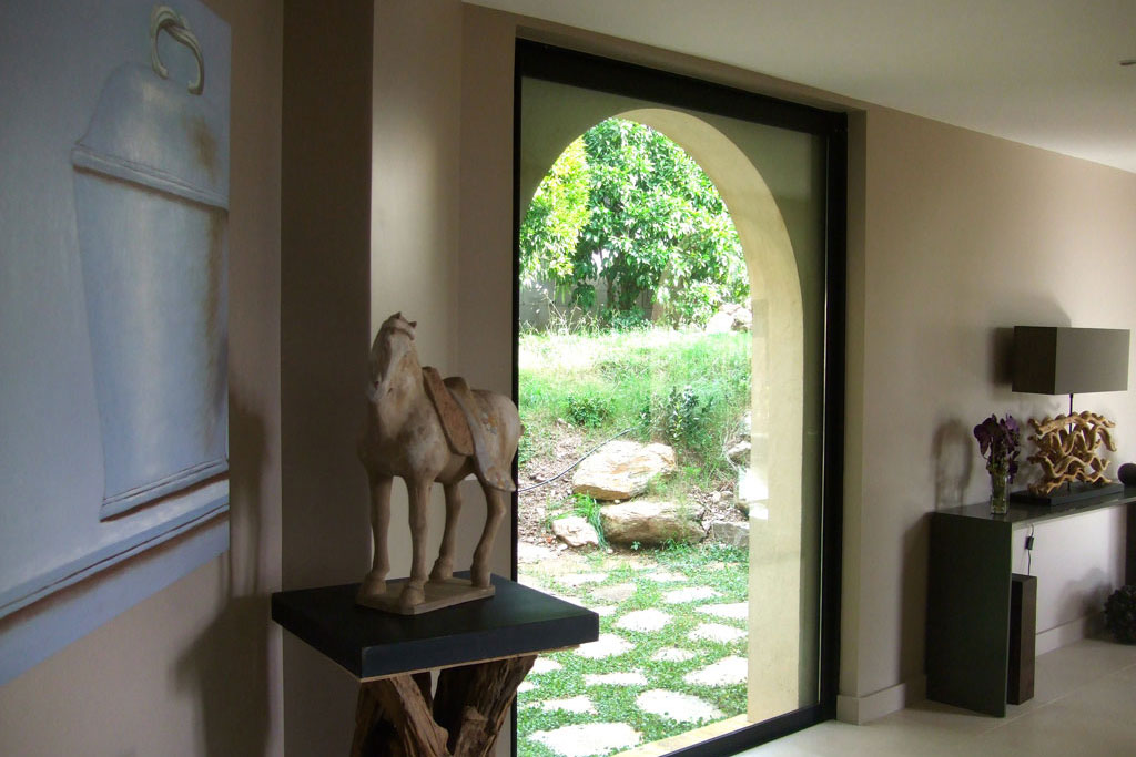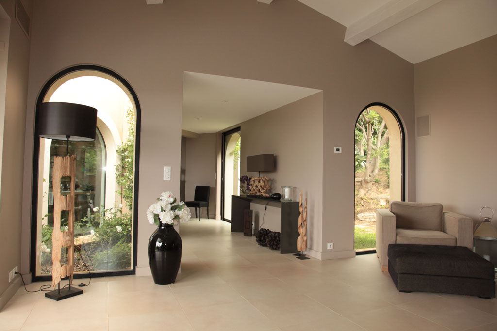 The living room is fellowed by 2 large glazed bays with a magnificient sea sight on the islands (île du Levant, Port Cros, Bagaud) furnished with 2 comfortable sofas and three armchairs. Progessive lighting and warm fireplace for winter nights.